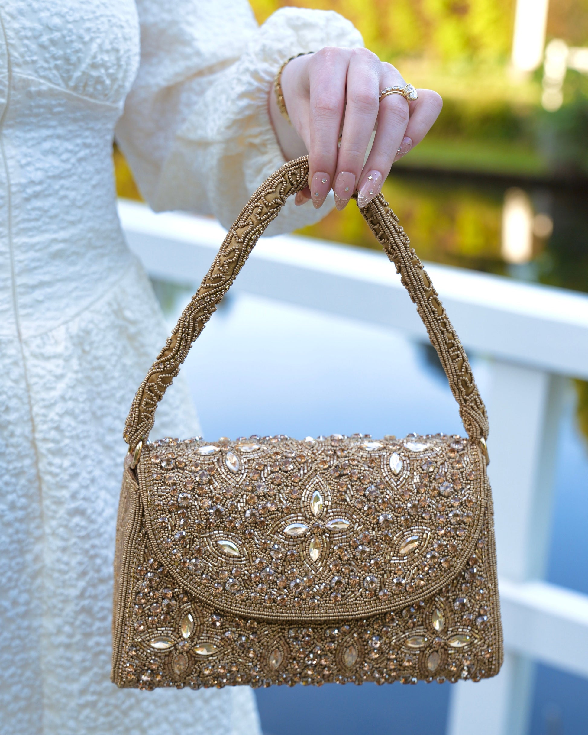 Dahab is a luxurious, handcrafted bag embellished with intricate golden beadwork and shimmering crystal accents. Its detailed design and rich texture make it a true statement piece for elegant outfits.