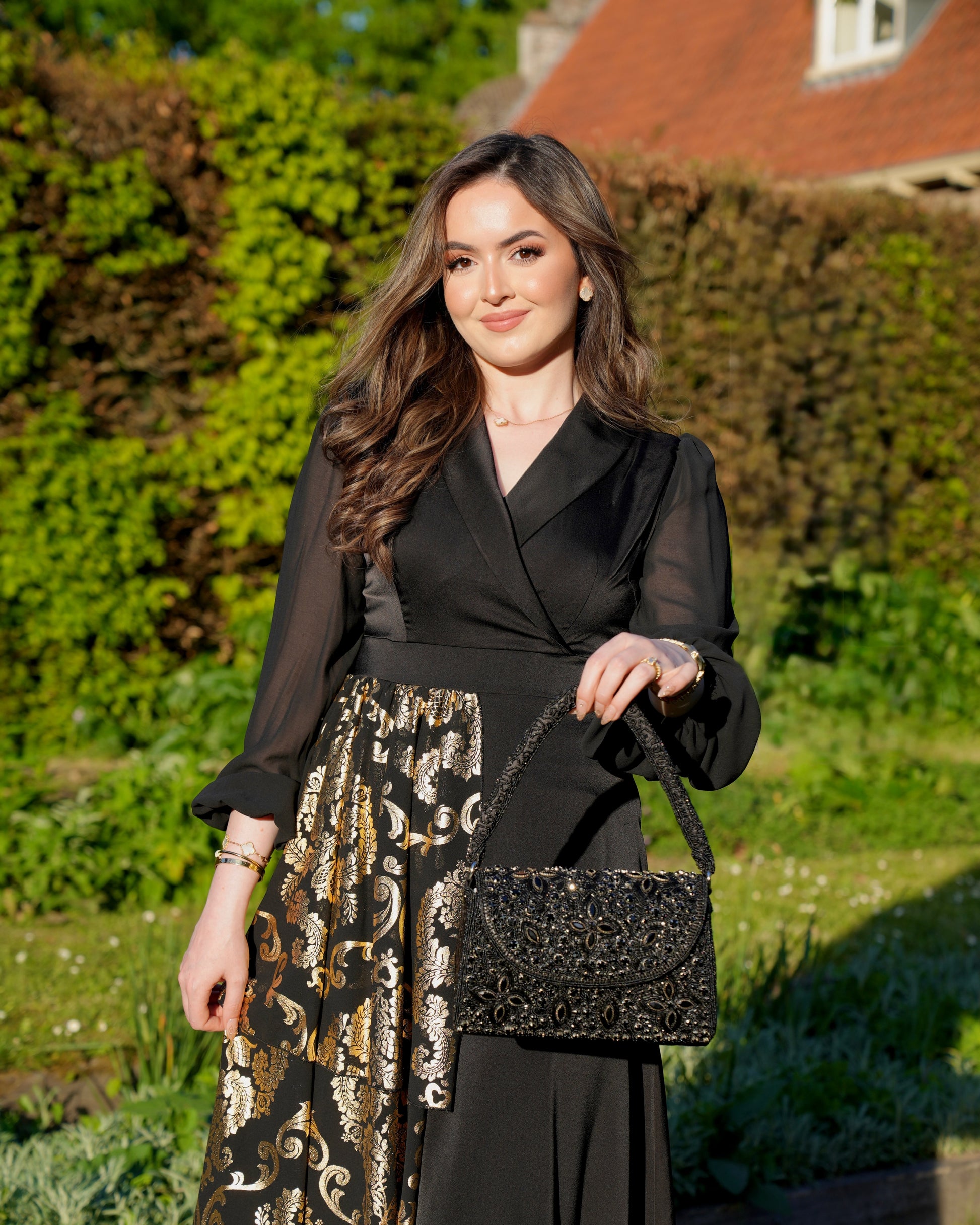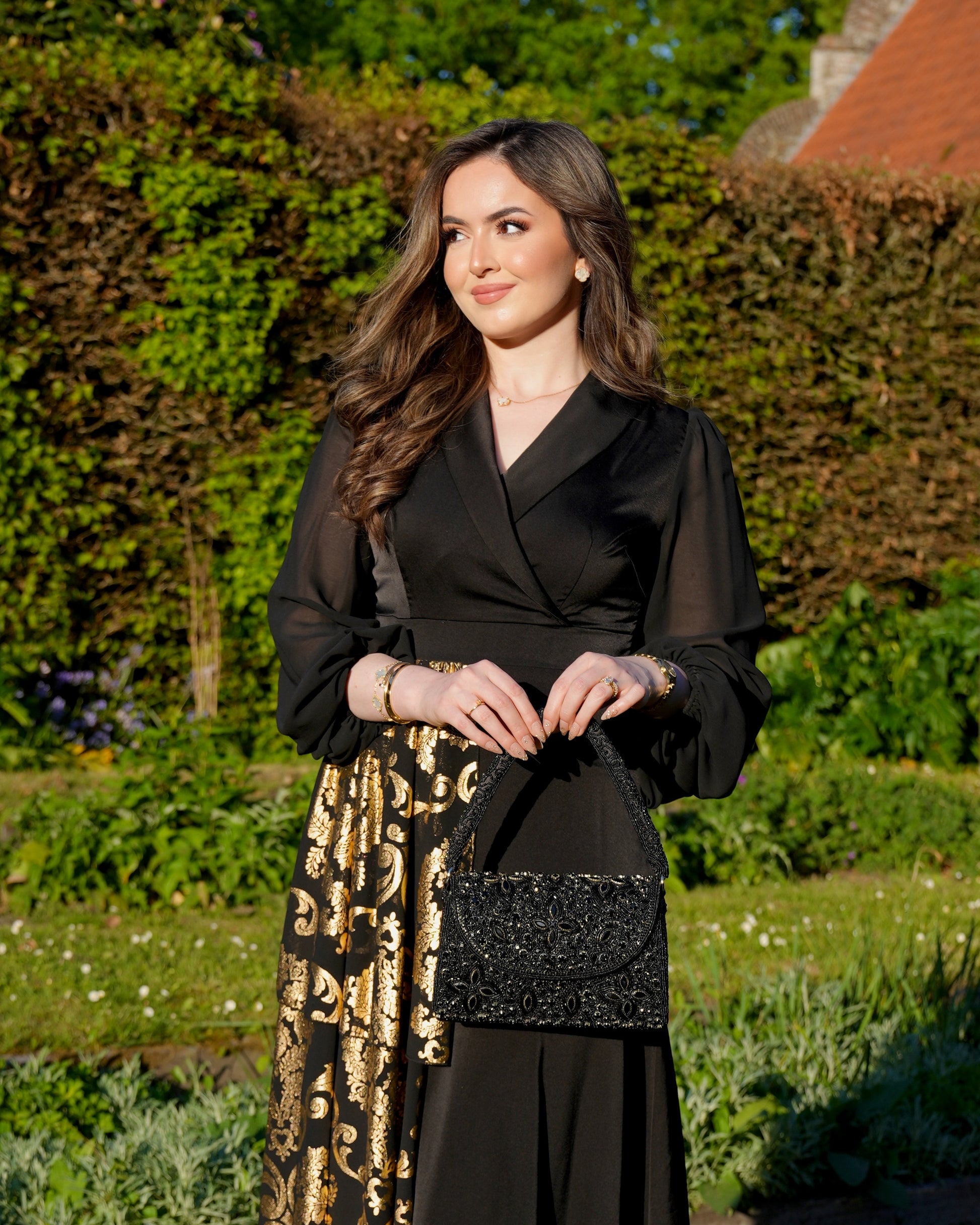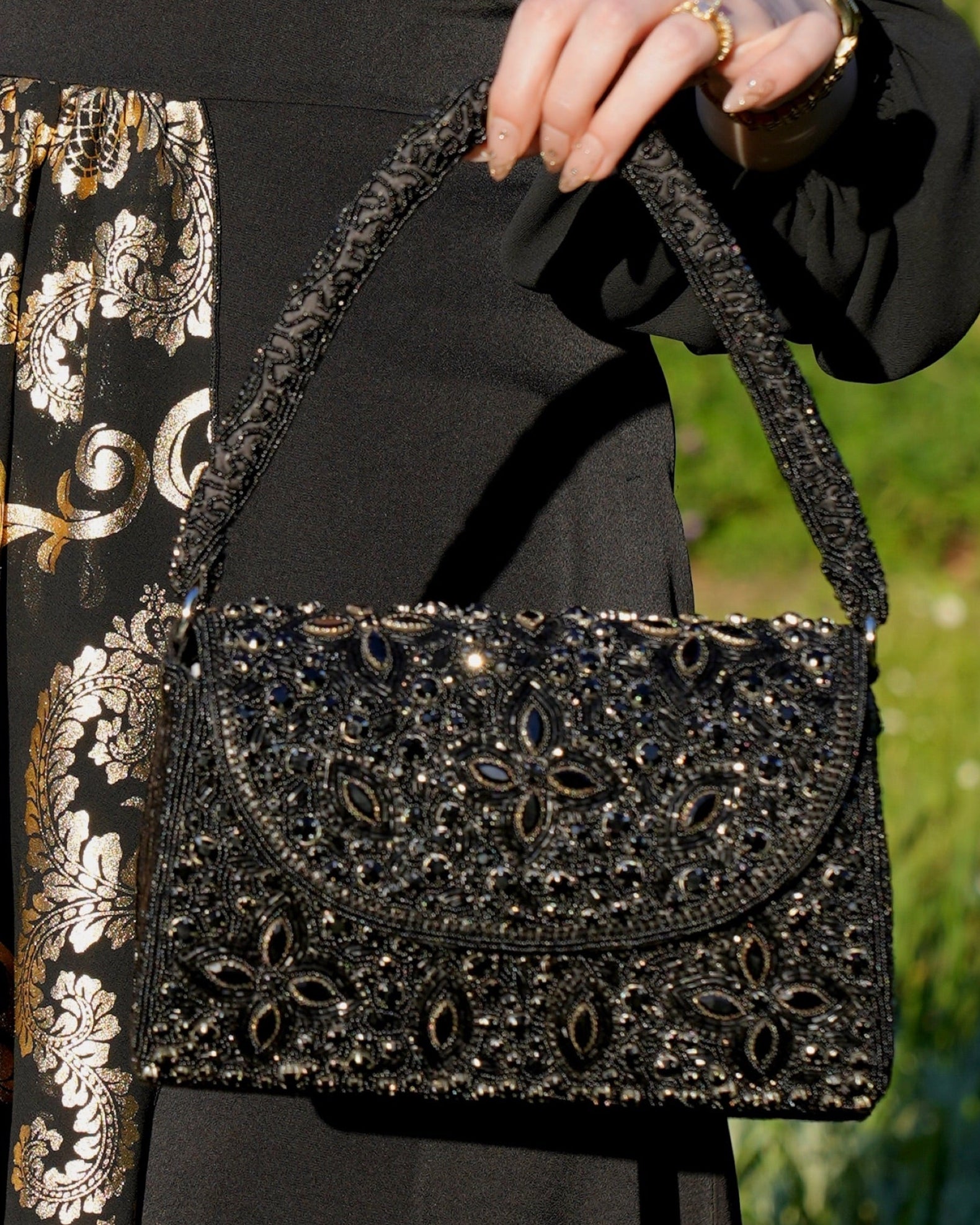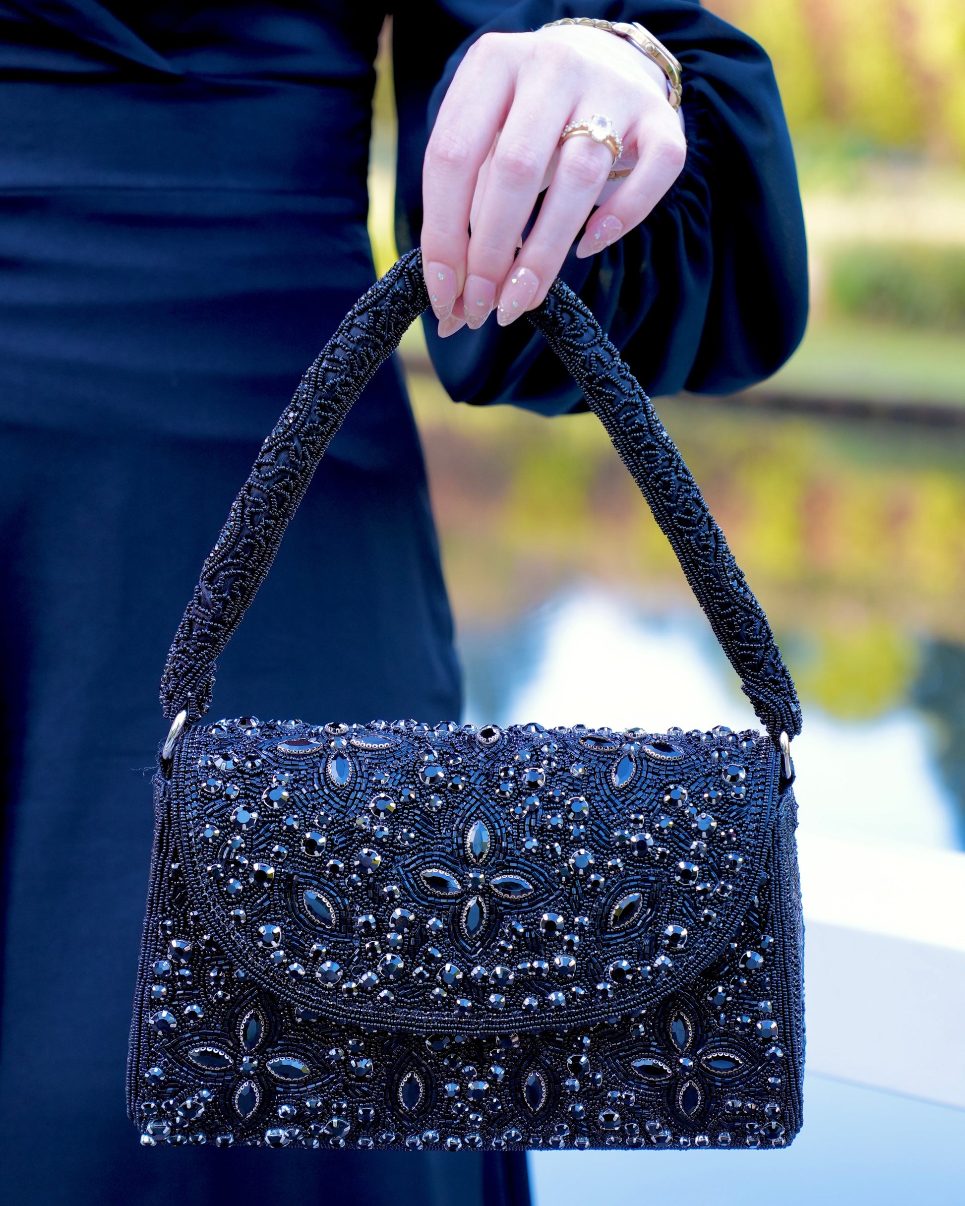 Noiré is a handcrafted top handle bag fully adorned with black crystals that shimmer subtly with every movement. Its classic shape and deep, all-black design create a look that’s both bold and endlessly elegant.