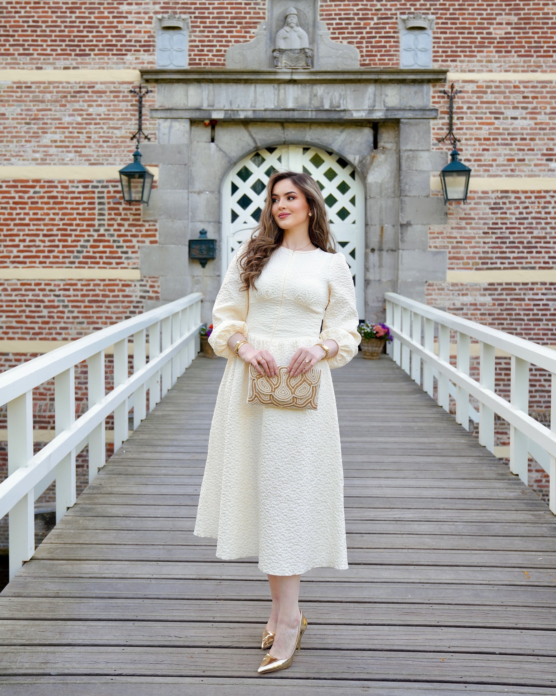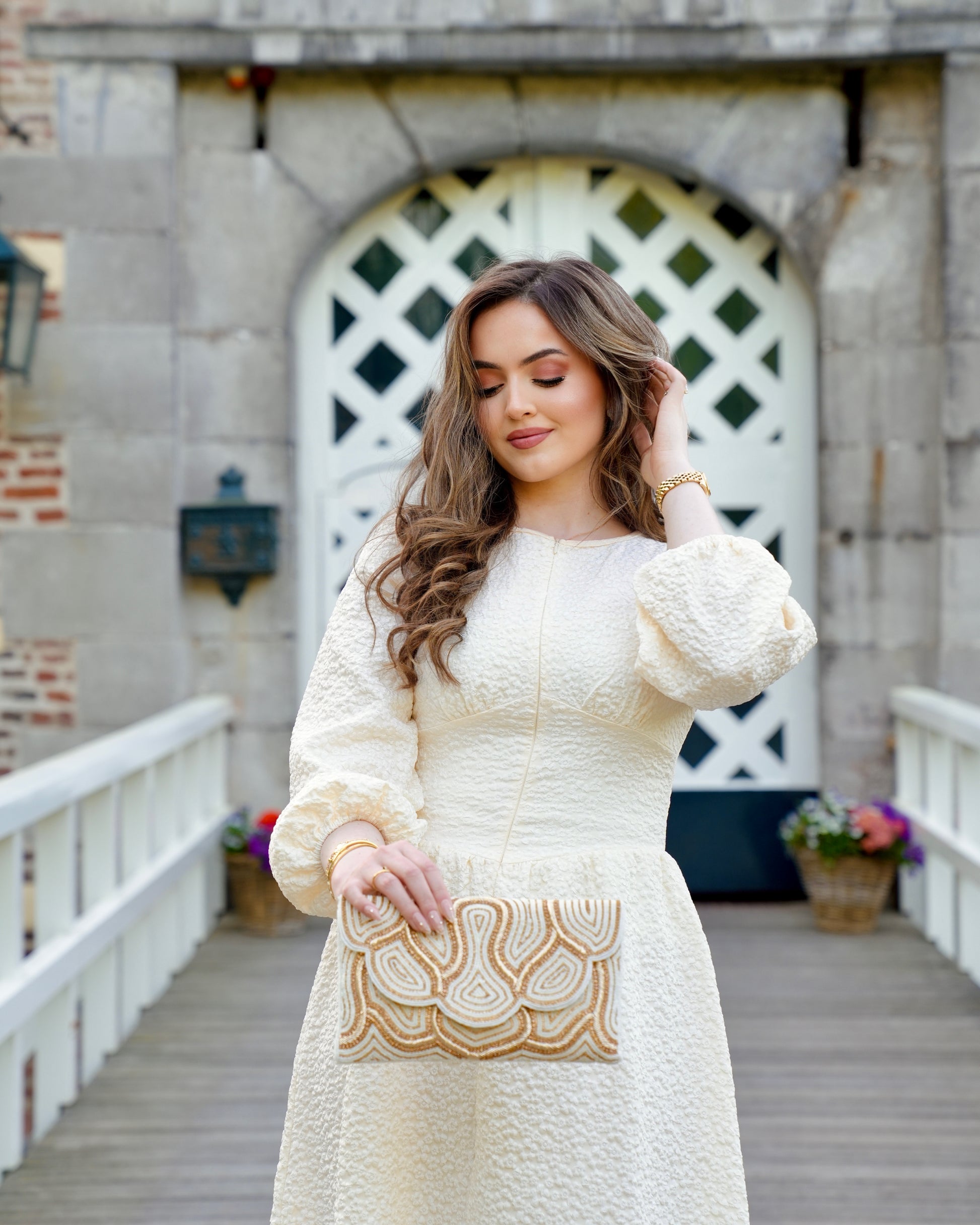Valeria is a handcrafted clutch featuring a flowing white and gold crystal pattern that shines with quiet luxury. The soft curves and intricate beadwork create a look that’s both artistic and refined.